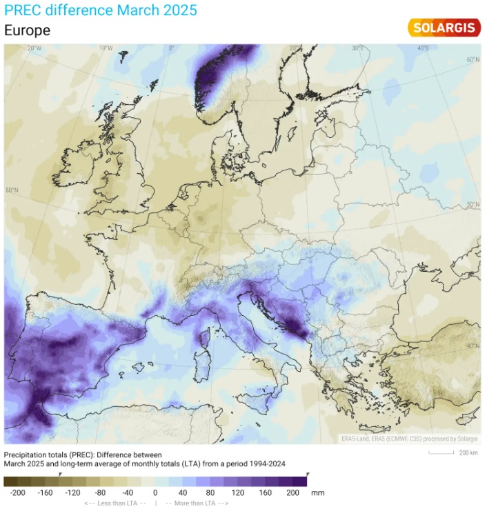 Más allá del GHI, los patrones de precipitación también se desviaron de las normas históricas, lo que pone de relieve la intrincada relación entre el clima y la producción de energía solar. En marzo se registraron hasta 200 mm por encima de la media a largo plazo de 30 años en España y Noruega, mientras que el Reino Unido y algunas partes de Alemania experimentaron hasta 140 mm por debajo de la media. Mayo fue notablemente seco en la mayor parte del noroeste de Europa, con hasta 80 mm por debajo de la media en el Reino Unido, Francia y Alemania.